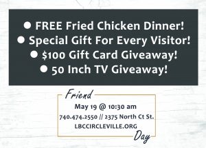 2375 North Ct. Street, Circleville Lighthouse Baptist Church Directions Friend Day 2019 Date May 19, 2019 Time 10:30 am Join us for Friend Day on May 19 @ 10:30 am. Free Fried Chicken Dinner! Special gift for all visitors! $100 gift card giveaway! 50 inch flat screen TV giveaway! Don’t miss this exciting service and don’t forget to bring a friend!