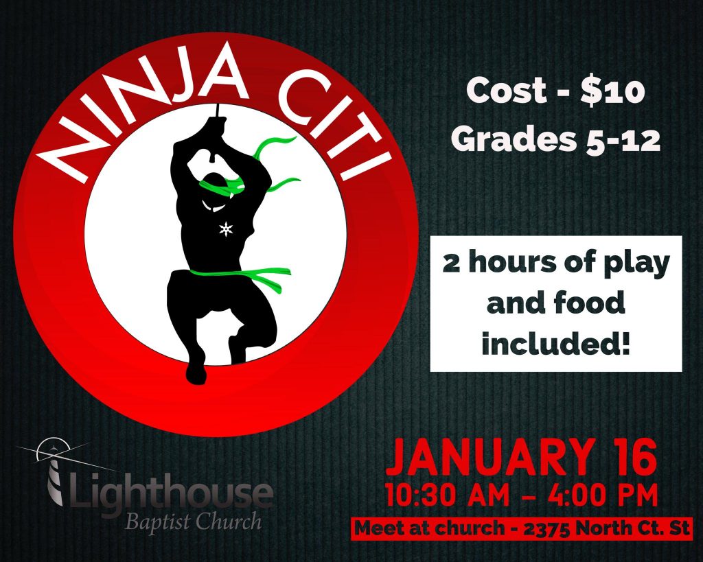 Our teens are headed to Ninja Citi on Monday, January 16! The cost is $10 which includes 2 hours of play, socks, pizza, and drinks. For those in grades 5-12. Parents MUST fill out online waiver in order for your teen to go (website like below). Youth will meet at the church (2375 North Court St, Circleville) at 10:30 am and return around 4:00 pm. https://ninjaciti.centeredgeonline.com/waivers