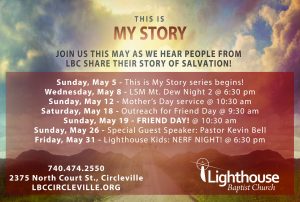 2375 North Ct. St. Circleville Lighthouse Baptist Church Directions This is My Story series Date May 5 – 26, 2019 Join us throughout the month of May as we hear personal testimonies from folks at LBC about their salvation story! Every Sunday in May!