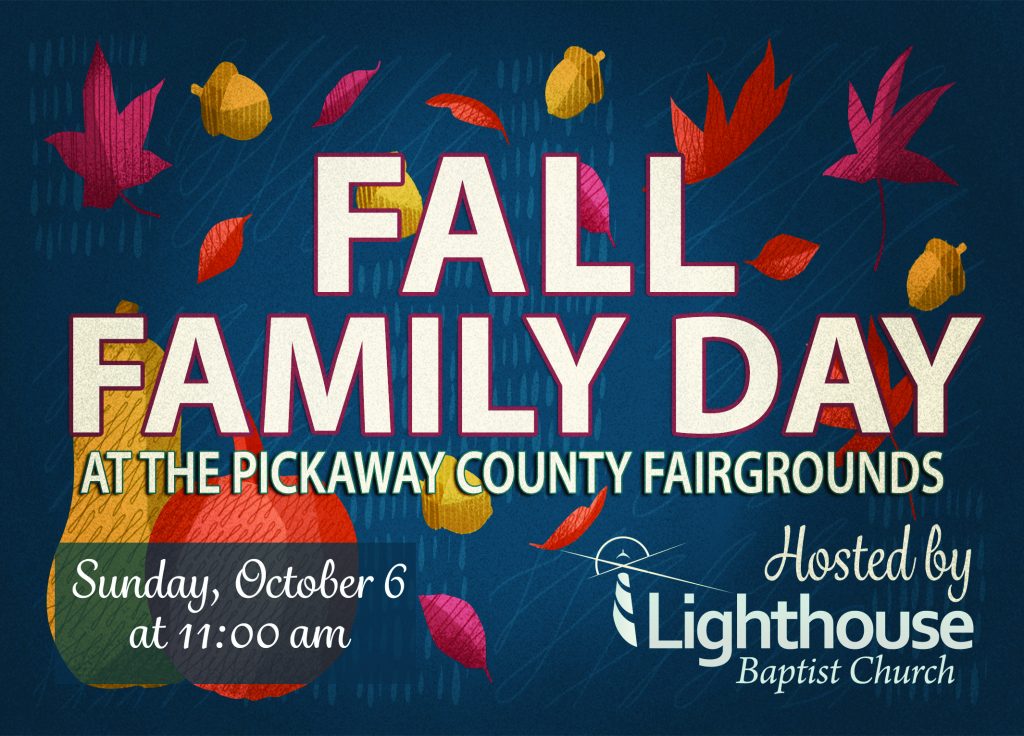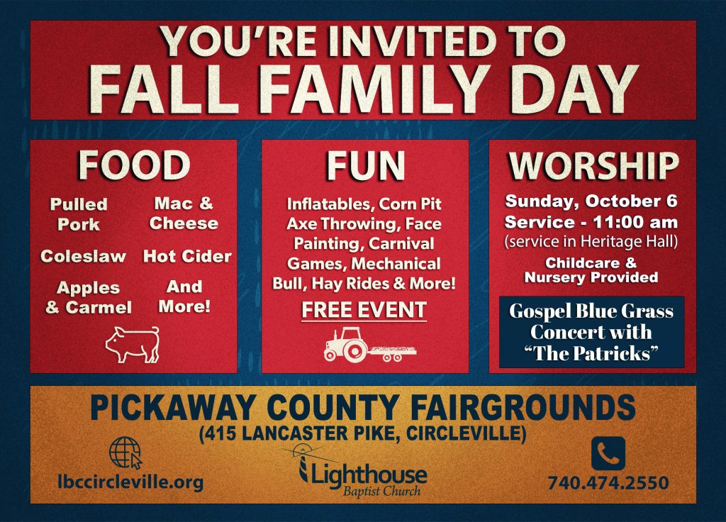 Join us for Fall Family Day at the Pickaway County Fairgrounds (415 Lancaster Pike, Circleville). Gospel Blue Grass Concert with “The Patricks”. Food, fun and Worship! Pulled Pork, Mac & Cheese, Hot Cider, Inflatables, Axe Throwing, Hay Rides, Mechanical Bull, Carnival Games and more! Sunday, October 6 at 11 am.