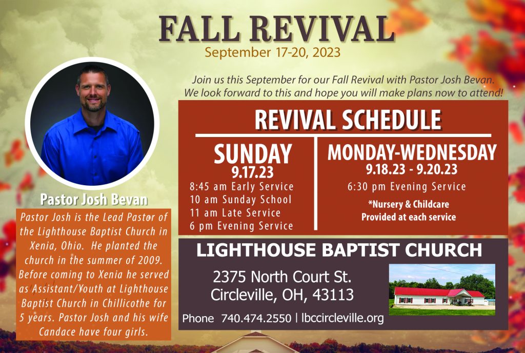 Fall Revival with Pastor Josh Bevan Date September 17 – 20, 2023 Time Sunday – 8:45 & 11 am, 6 pm// Monday – Wednesday – 6:30 pm Venue Lighthouse Baptist Church Category Entire Church