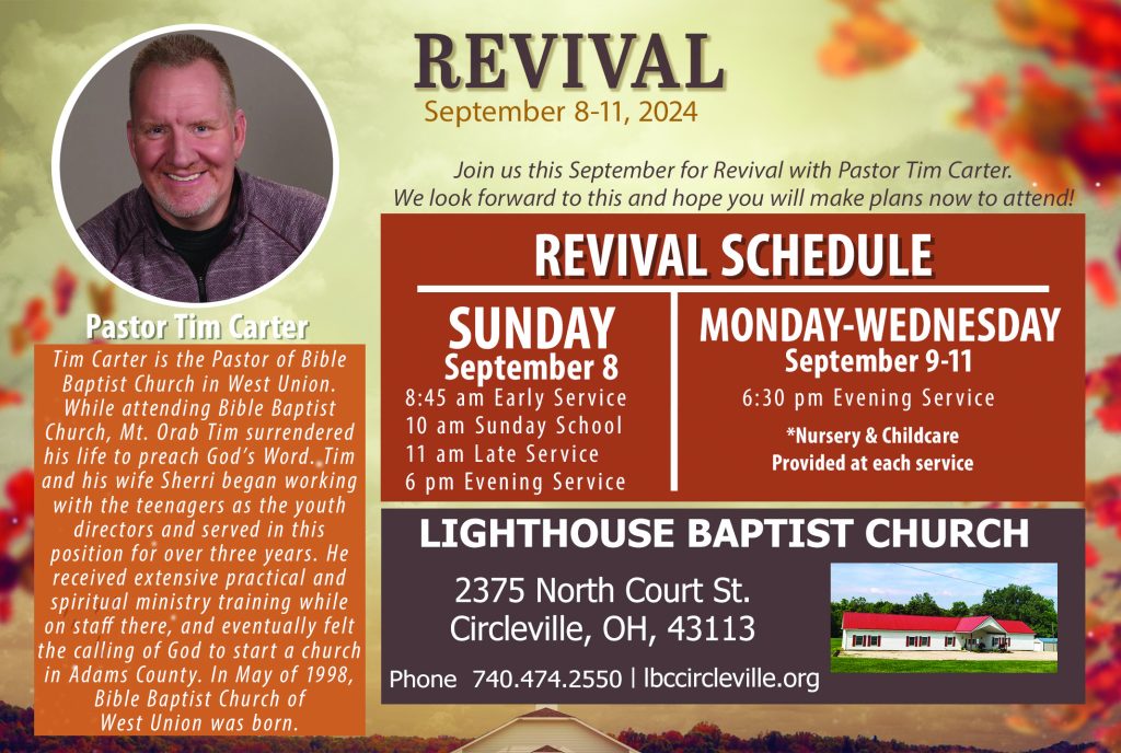 Pastor Tim Carter from Bible Baptist Church in West Union will be joining us for revival services beginning Sunday, September 8 through Wednesday, September 11. Don’t miss these powerful services! Sunday, 8:45 am, 11:00 am, 6:00 pm. Monday through Wednesday at 6:30 pm. Nursery and childcare provided at each service.