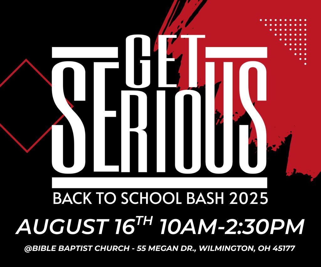 Our teens are going to Bible Baptist Church in Wilmington for the Back to School Bash 2025! We will meet at the church at 8:00 am on Saturday morning, August 16. Join us for fellowship and two messages about getting serious in your walk with the Lord! Activities include: inflatables, car demolition, snow cones, gaga, basketball, volleyball, and more! Cost: $5. Grades 6-12.