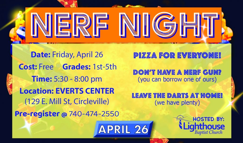 NERF NIGHT! Pizza, giveaways, and lots of fun! Need a NERF gun? You can borrow one of ours! Leave your darts at home, we’ll have plenty. At the Everts Center: 129 East Mill St., Circleville. Friday, April 26 from 5:30-8:00 pm. This is a FREE event! Grades 1st – 5th. To pre-register call 740-474-2550.