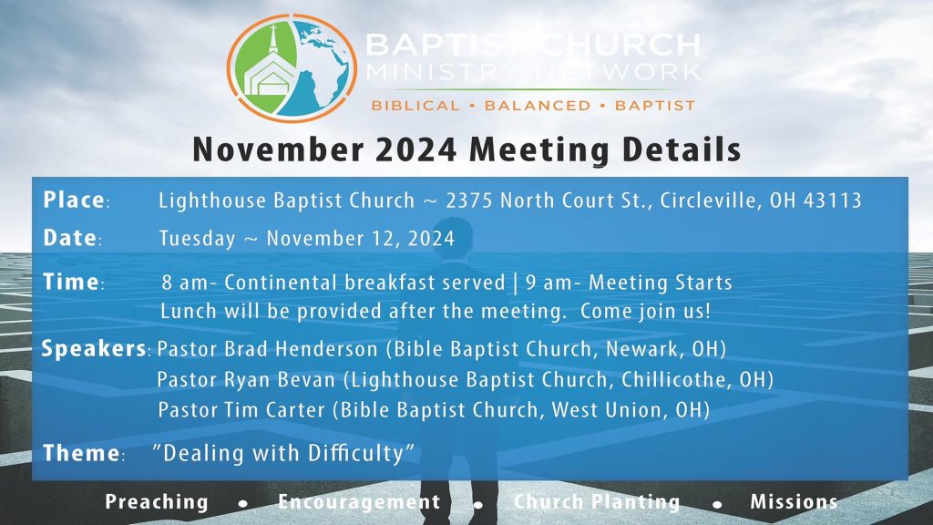 On Tuesday, November 12 we will host a ministry meeting for the Baptist Church Ministry Network of Ohio. The meeting will start at 9:00 am.