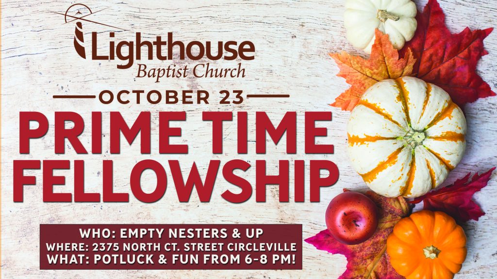 Our next Prime Time Fellowship is Thursday, October 23 from 6-8 pm. As usual, this is a potluck. Please bring dish to share! Empty nesters age and up.