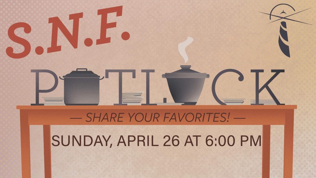 Join us on April 26 at 6:00 pm for our next SNF! This month the theme is POTLUCK! Bring any favorite dish to share with your church family!