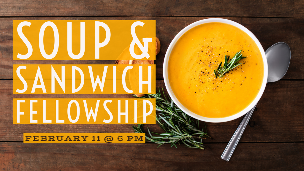 Bring your favorite soup or dessert to share. The church will provide sandwiches and drinks. Sunday, February 11 at 6 pm. Sign up at the welcome center.