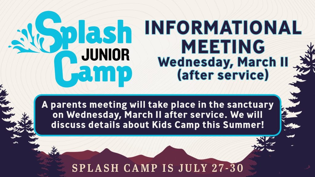 A parent’s meeting will take place in the sanctuary on Wednesday, March 11, after service. We will discuss details about Splash Kids Camp this Summer! Splash Camp takes place July 27-30 for kids entering 4th grade through 6th grade.
