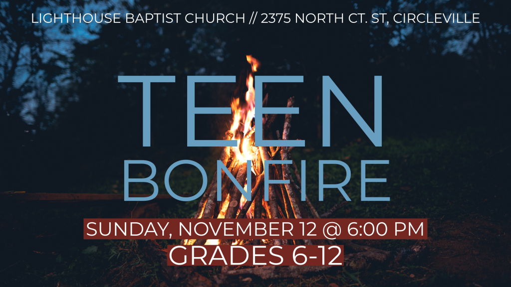 Teen Bonfire Date November 12, 2023 Time 6:00 pm Address 2375 North Court Street, Circleville Ohio 43113 Directions Venue Lighthouse Baptist Church Category Student Ministry Sunday, November 12 at 6:00 pm! Food, games and s’mores! Grades 6-12.