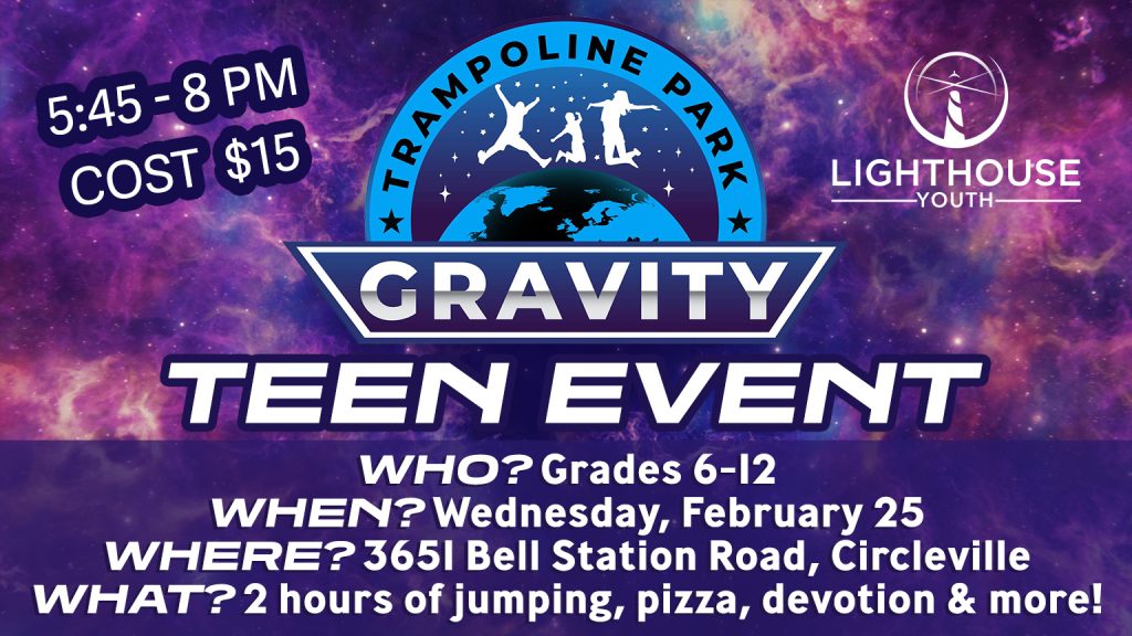 Teens will jump for two hours, eat pizza, enjoy devotion and more! From 5:45-8 pm. Grades 6-12. Cost is $15. Location: 3651 Bell Station Road, Circleville.