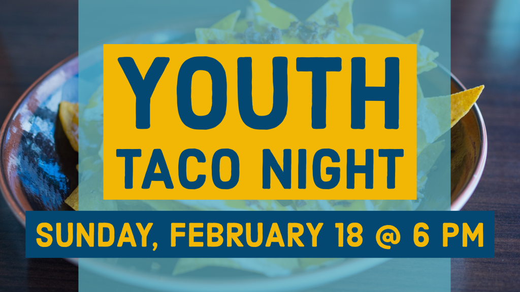 Our teens will enjoy tacos on Sunday, February 18 at 6:00 pm. All those grades 6-12 join us for a night of food, fun and fellowship!